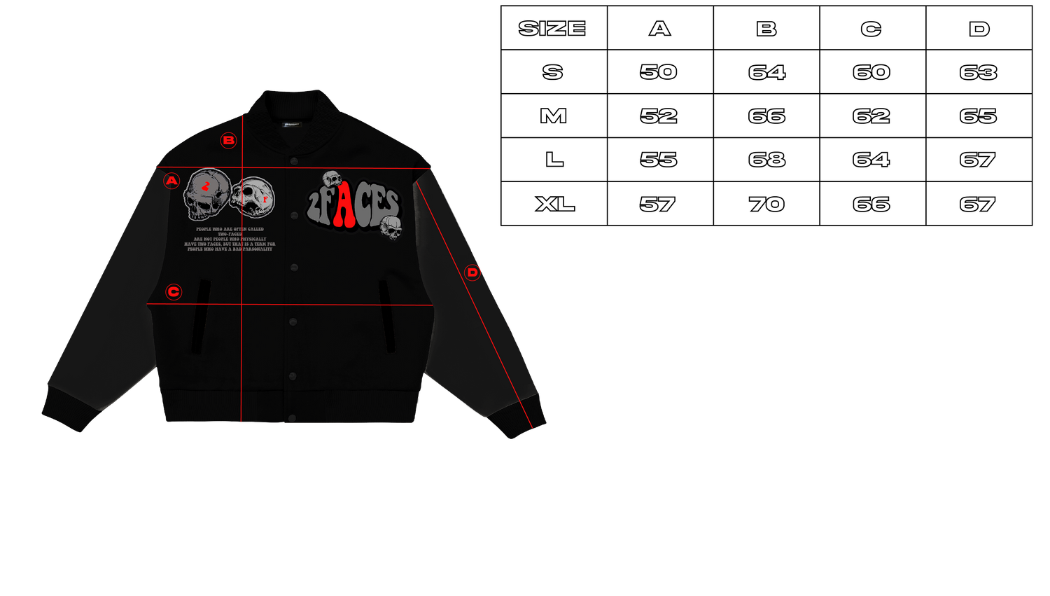 2FACES VARSITY JACKET unisce la storia di due artisti in una giacca di alta qualità con un fit boxy ed un design semplice ma accattivante.